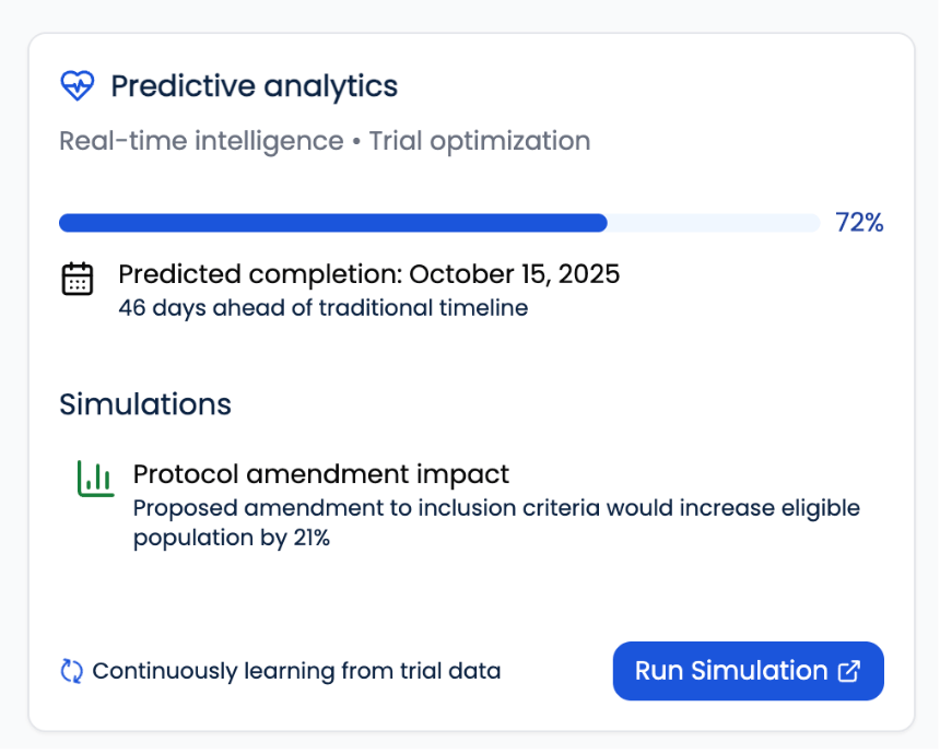 Real-time dashboards and AI-powered alerts allow teams to identify and address study risks and protocol deviations as they happen.